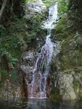 中游則是險中之險,短短五百米水平,先是"猿啼峽"壁崖垂削,左為"簷崖四壁",右為"鳳羽絕崖",澗道直上是無法上攀的"鳳舞瀑",盡是窮山惡水.最險的是"下飛簷崖",跟本不可通行,但險的何止"下簷崖"?從"簷崖棧道"回主澗,先有十多尺高的"藤梯崖",再有全段最難爬的廿多尺高瀑,全是濕壁,甚難爬,於瀑水會照頭淋,增加了爬壁難度,有5星難,十分消耗體力。過此崖不久再翻越一水管壁就可回鳳徑。